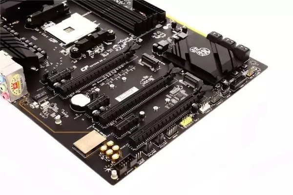 在Ryzen 5上市的同时,我们也在第一时间拿到了一款七彩虹AM4主板中的高端产品——七彩虹战旗C.X370AK X5 V14。该主板采用了6相供电,拥有4条内存插槽、3条PCI Express 3.0x16显卡插槽、2条mini M.扩展卡槽,支持AMD CFX显卡交火技术、PCIE x4 SSD&MSATA SSD硬盘接口,并提供了一个DVI+DP+HDMI显示接口。