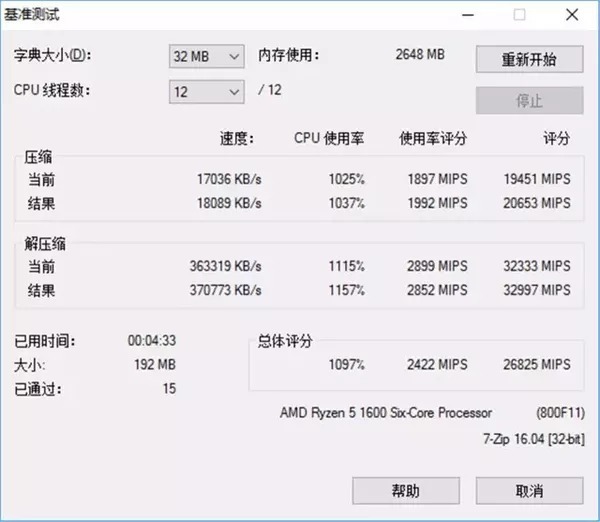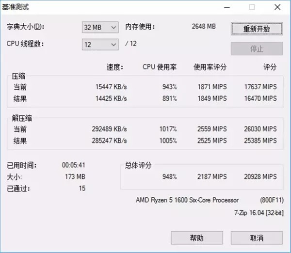 用7-Zip检测Ryzen 5 1600的解压缩能力,可以看到得分为20928MIPS。